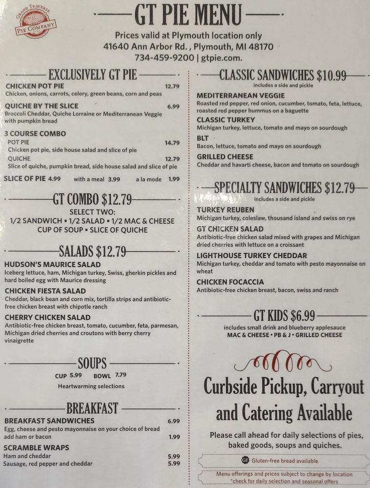 Introducing the menu at Grand Traverse Pie, a delightful culinary destination located in Plymouth, MI. Specializing in soups, sandwiches, and salads, this eatery is renowned not only for its comforting meals but also for its exceptional pies. Patrons rave about standout dishes like the cherry chicken salad and the nostalgic Maurice Salad, which have garnered passionate reviews. Their famed pies — particularly the blueberry crumb and Michigan ABC crumb — craft a perfect ending to any meal.